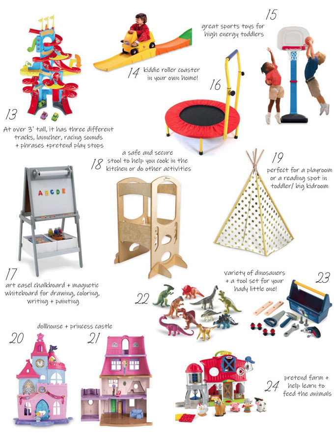 Now that Kennedy is two years old, she is understanding Santa Claus, presents and Christmas! Whenever she sees Christmas lights or any decorations she exclaims “Christmas!!!” She also LOVES Santa now and didn’t even cry this year when she visited him. We took Kennedy with us to the local buybuyBABY store to pick up some more diapers and take a look at the new toys they have for the holidays. I wanted to get an idea of what she would be interested in before we buy something. She was obsessed with this farmhouse, her baby doll, and this skyway race car set! We picked up a few toys for her for Christmas while we were there and I’m sharing some of my selections below! Obviously, we did not get her everything that I have picked out below for the Gift Guide, but I wanted to share things she already has or what I would recommend for toddlers her age! I chose a large variety of toys in different categories for boys and girls. Most of these toys are suitable for ages 24 months plus!