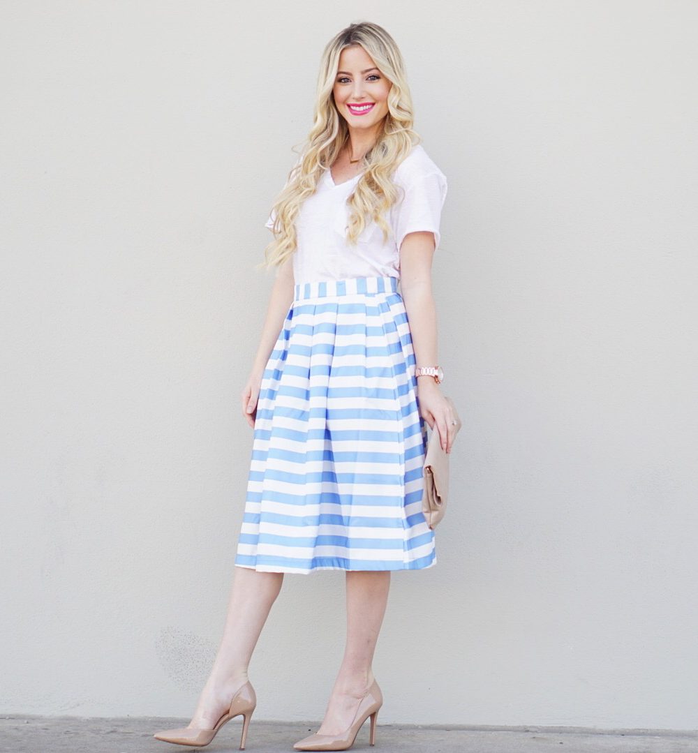 BLUE STRIPED MIDI SKIRT c/o: Dreaming in Pink Boutique | WHITE POCKET TEE c/o: LuLu's (Comes in 3 different colors) | CLUTCH c/o: LuLu's | ROSE GOLD WATCH: Read This Post