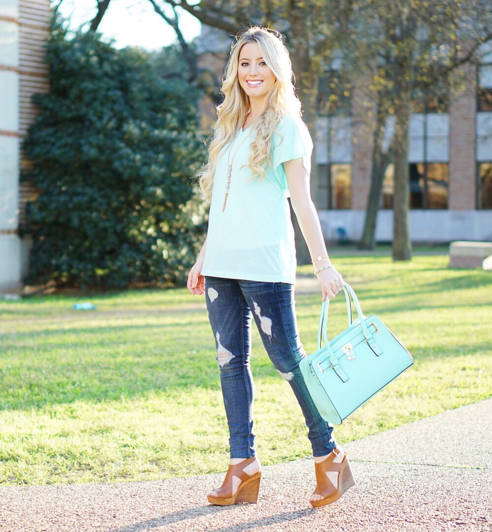 TEE SHIRT c/o: Charming Charlie | NECKLACE c/o: Charming Charlie | PURSE c/o: Charming Charlie | MINT BRACELET c/o: Charming Charlie (ON SALE: $4.99!!) | Read This Post