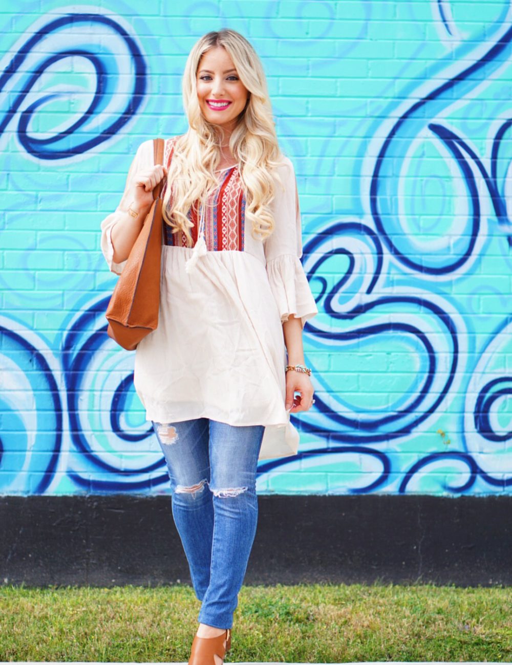 PEASENT TUNIC c/o: Single Thread Boutique | JEANS: AG Jeans | WEDGES: Michael Kors (15% OFF right now) | TOTE: Nordstrom (reversible too)!| BRACELET c/o: Read This Post