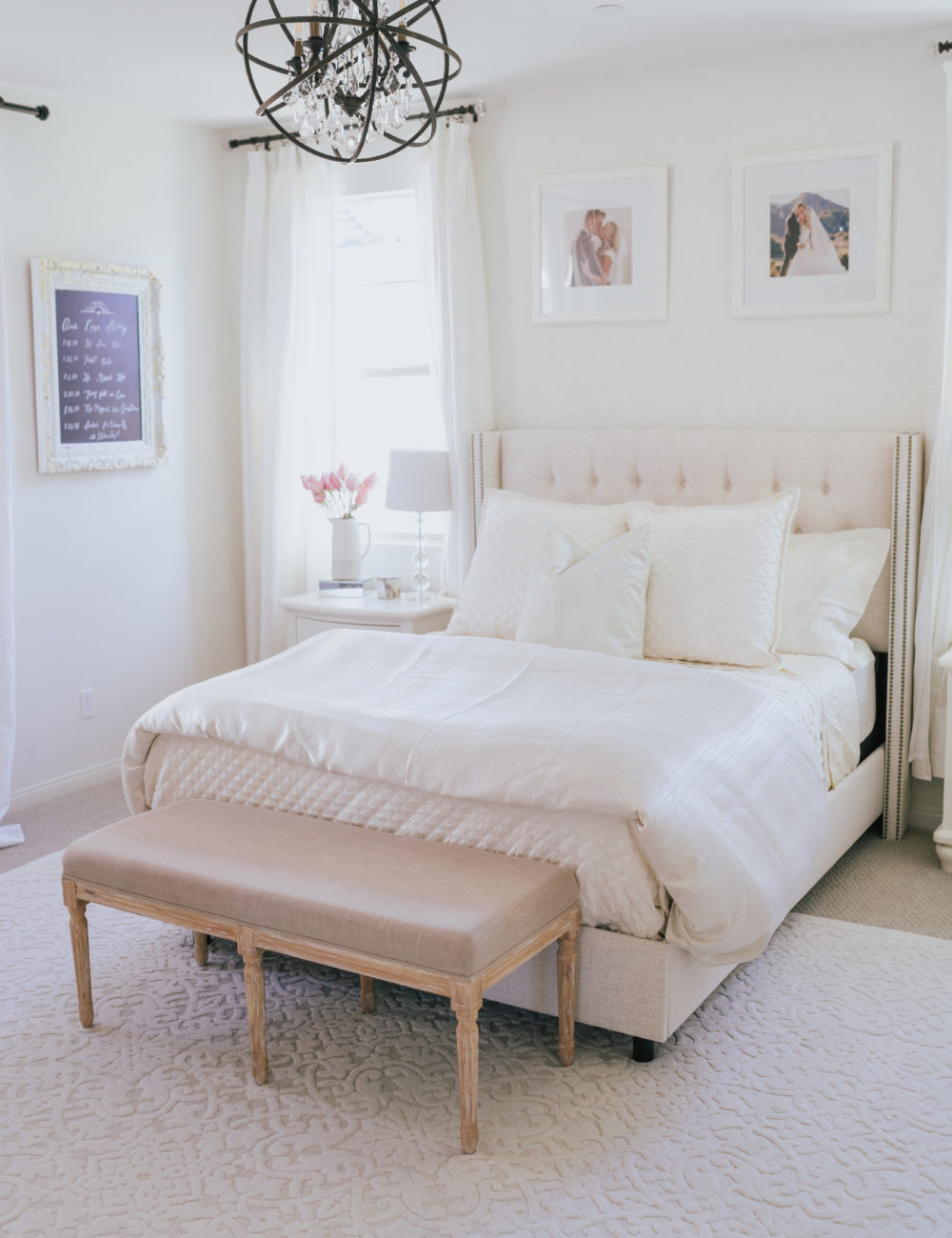 KATHY KUO BEDDING SET | LIGHT FIXTURE | HEADBOARD | NIGHTSTANDS | BENCH | AREA RUG | LAMPS | FLOWERS | GOLD FRAME | ABOVE BED PICTURE FRAMES | KNIT SWEATER Read This Post